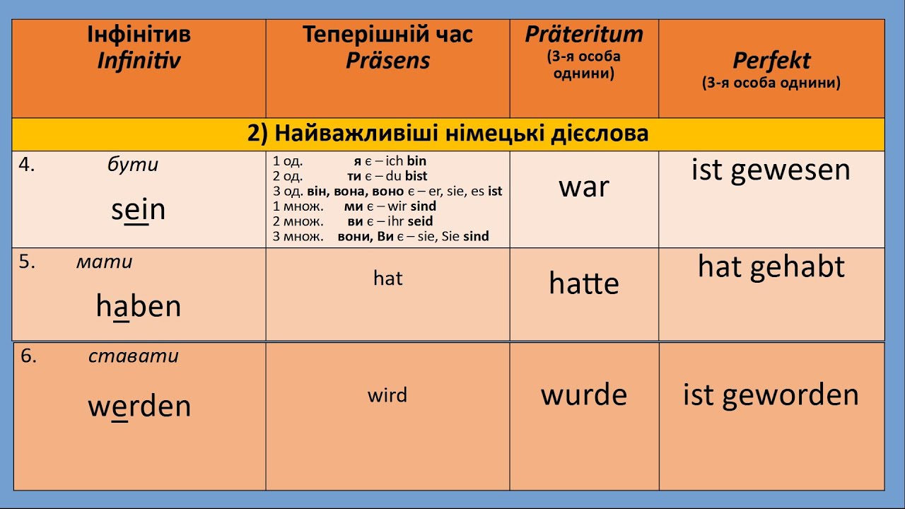 Наприклад, дієслово sein («бути») має три форми: sein – war – gewesen. Вивчення сильних дієслів у німецькій мові в таблицях (адже це найзручніший спосіб подання матеріалу) дасть змогу краще орієнтуватися в цих формах та швидко їх запам’ятати.
