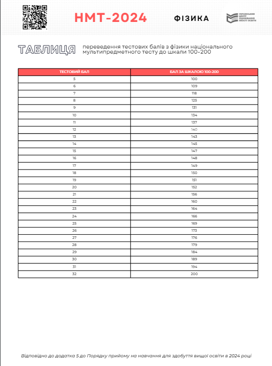 Таблиця переведення балів НМТ 2024 з фізики