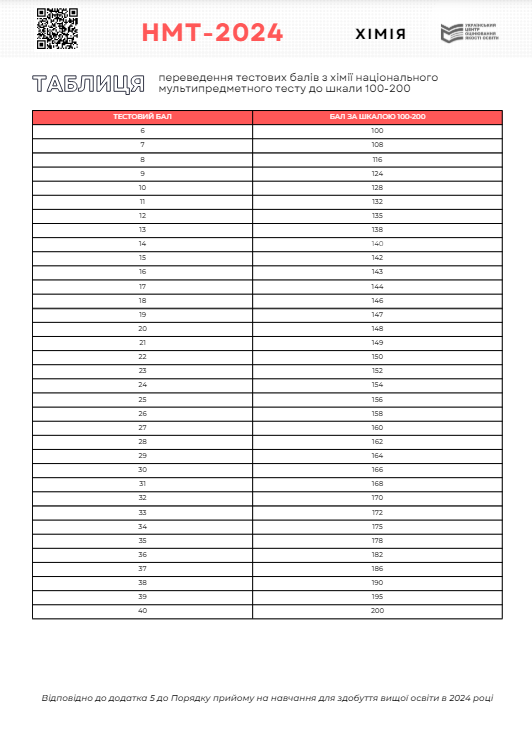 Таблиця переведення балів НМТ 2024 з хімії
