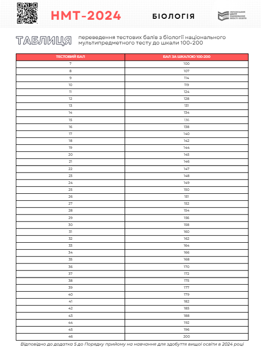 Таблиця переведення балів НМТ 2024 з біології