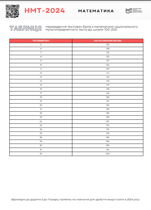 Таблиця переведення балів НМТ 2024 з математики