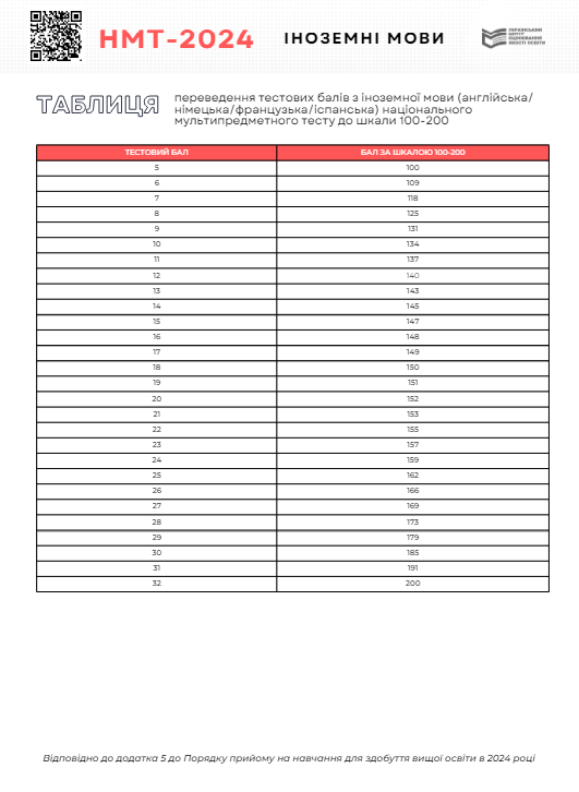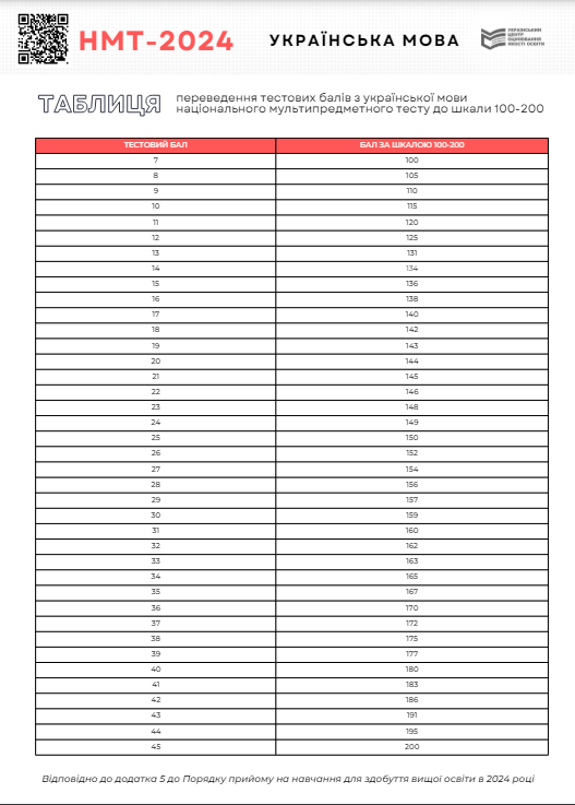Таблица перевода баллов НМТ 2024 по украинскому языку