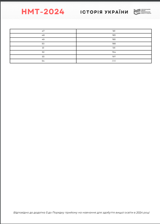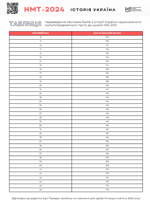 Таблица перевода баллов НМТ 2024 по истории Украины